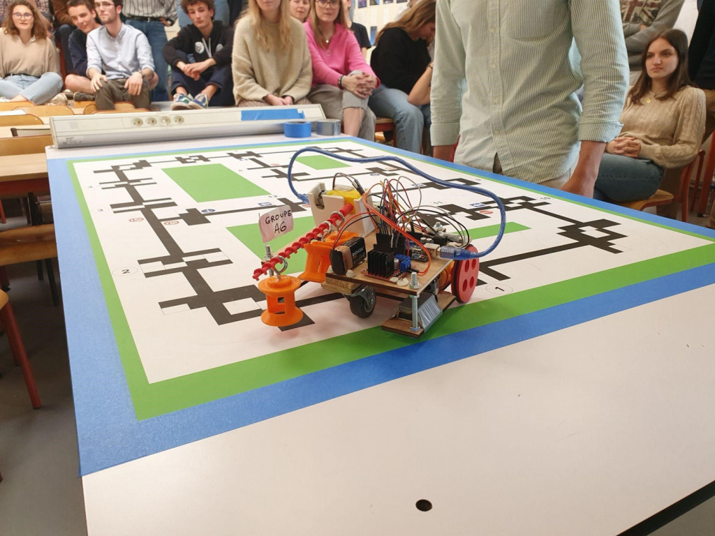 Dans une ambiance plus détendue – et avec un niveau sonore inévitablement plus important – l’ensemble de la promotion a supporté les pilotes des robots s’affrontant en duel lors de la phase finale. L’après-midi s’est conclue par la remise des prix au groupe ayant réalisé le robot le plus rapide pour accomplir la livraison des 3 colis, ainsi qu’à un second groupe, récompensé pour la conception poussée de son robot, entièrement autonome.