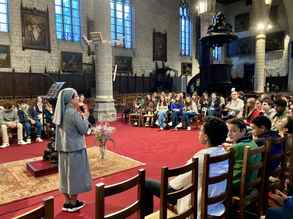 Nous nous sommes d’abord réunis pour un temps d’enseignement, de partage et de témoignage en l’église Sainte Catherine à Lille. Les temps forts sont toujours des moments privilégiés pour montrer aux jeunes que l’on peut vivre sa foi de beaucoup de manières différentes : par les sacrements, mais aussi par le témoignage de sa vie, comme cette religieuse qui a consacré sa vie à Dieu et à la prière.