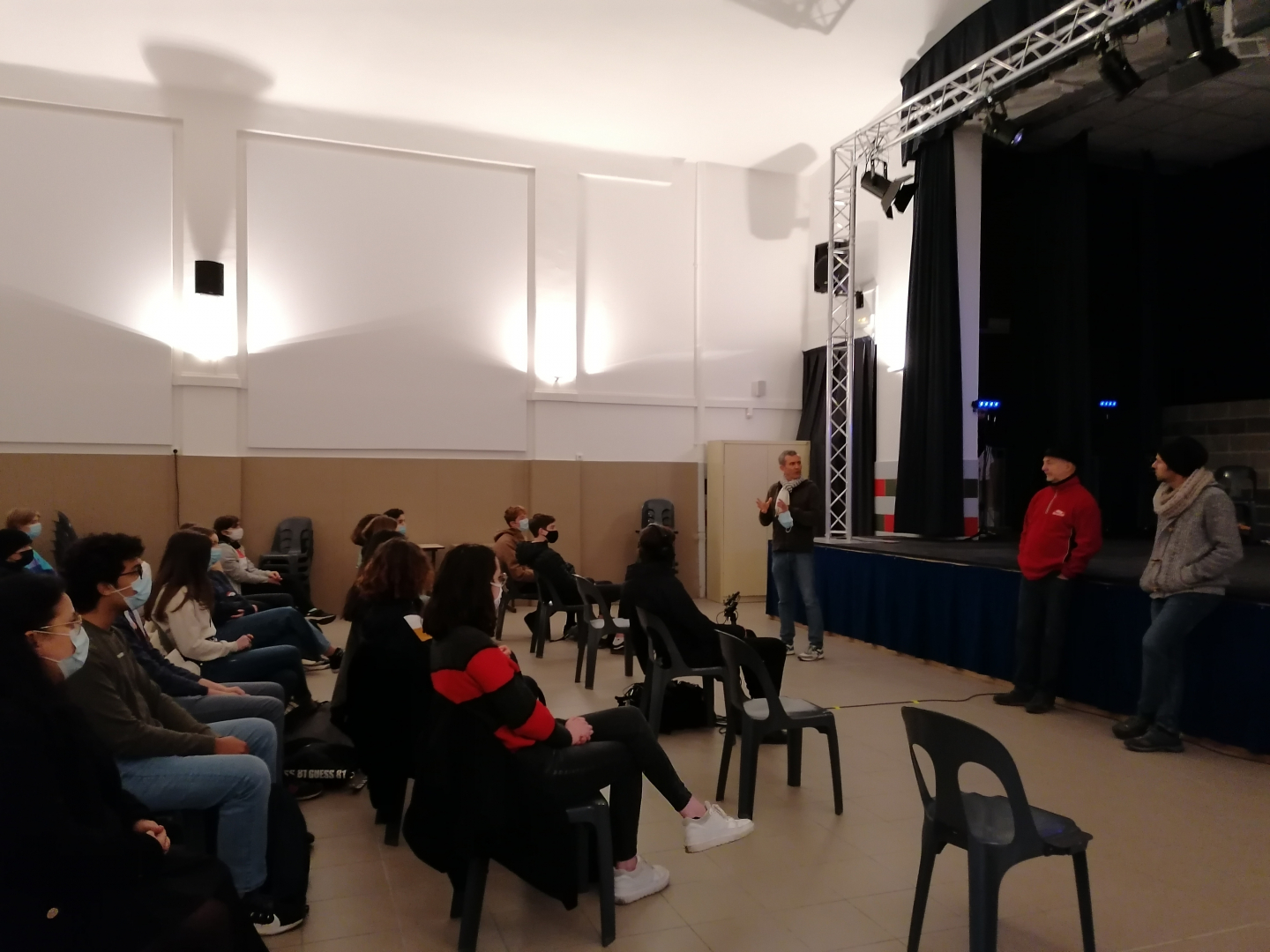 Les 7 et 8 décembre, toute l’équipe était réunie au lycée: un réalisateur, Frédéric Touchard, assisté d’un ingénieur du son, Adrien. La direction artistique du projet, Thierry Poquet et Marc Duport (compagnie Eoliesonge), un musicien, compositeur, Ivann Cruz, et l’équipe technique, François Breux (régisseur) et Gordo (éclairagiste). Nous les remercions.