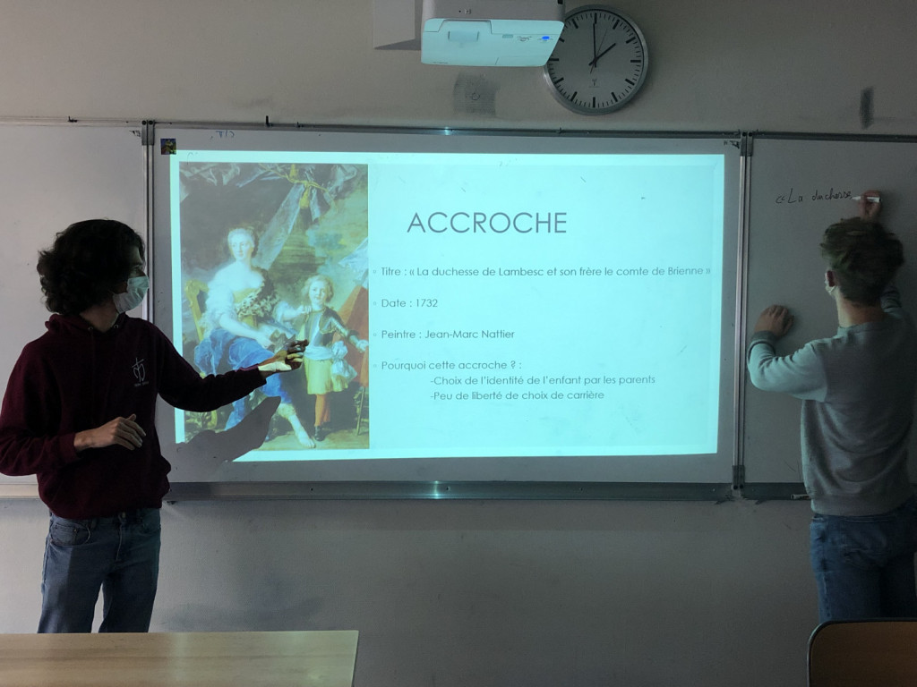 Nos CPG2 réalisent en ce moment devant leurs classes, durant leur cours de Formation Humaine et Sociale, des exposés détaillant la nature et l’éducation des Hommes, l’apprentissage du langage et des valeurs humaines. Ils s’appuient pour cela sur des œuvres d’art et les livres du programme. C’est l’occasion pour eux de travailler des power-points soignés, des prises de parole maîtrisées et leur culture générale. Certains ont même pris l’initiative de proposer des questionnaires, type « kahot » par exemple, pour tester la compréhension de leur auditoire.