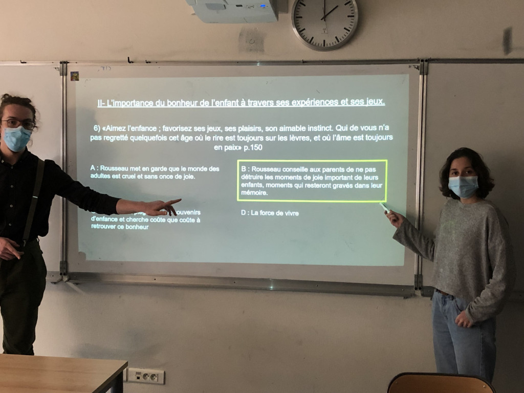 Baptiste Froberger et Coline Demoncheaux (CPG2 A) animant leur exposé sous forme de QCM adressé à leurs camarades