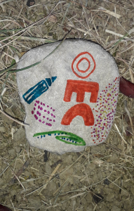 L’idée est la suivante : disperser partout où nous emmenons nos jeunes (voyages, sorties) des galets (achetés dans le commerce et non prélevés dans la nature) décorés et portant le logo OEC.