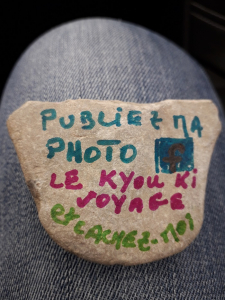 L’espoir est que quelqu’un trouve un caillou, poste sa photo sur le groupe Facebook que nous avons créé a cet effet (le kyou ki voyage) et à son tour le fasse voyager…