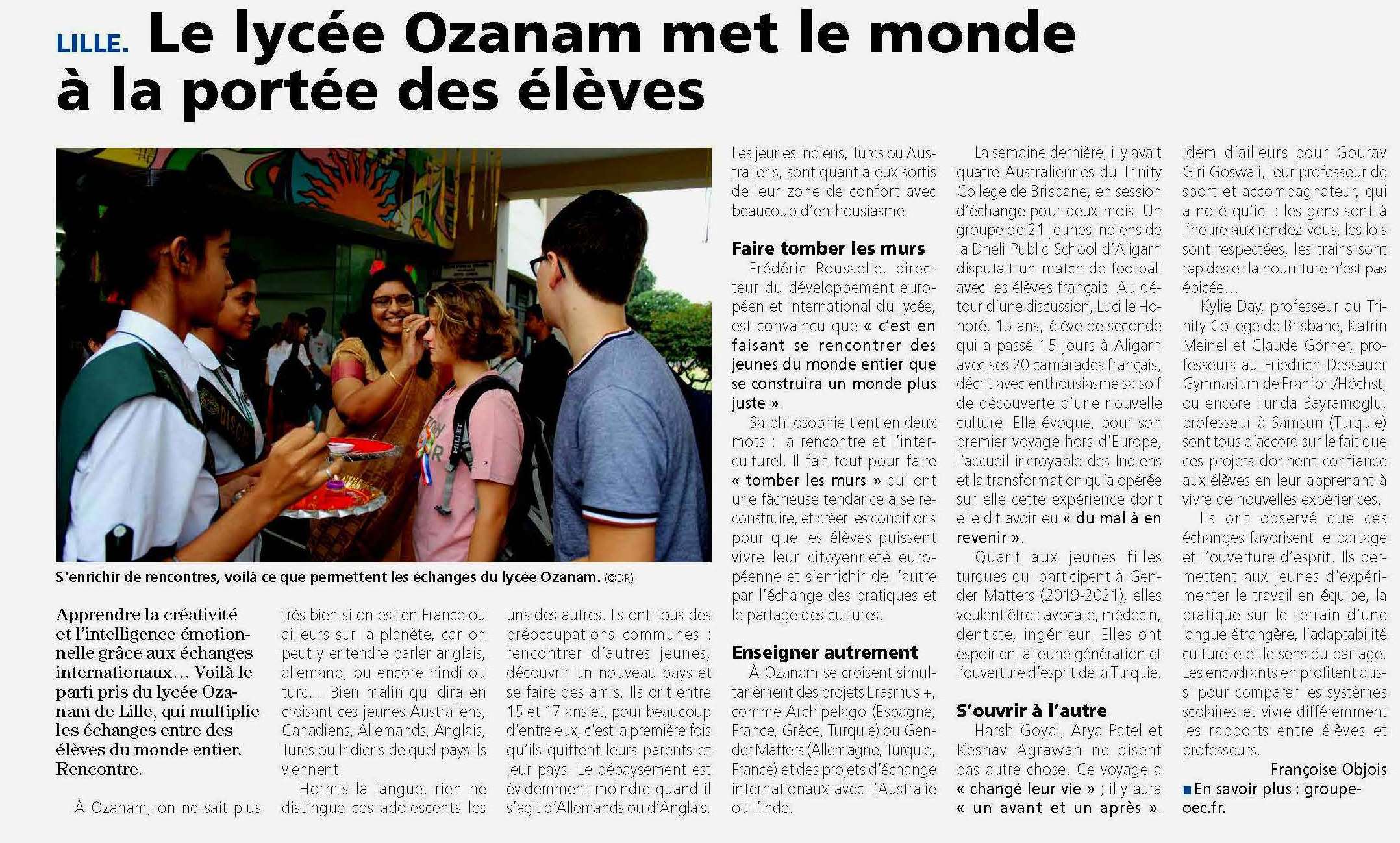 Le lycée Ozanam met le monde à la portée des élèves, c’est ce que Françoise OBJOIS journaliste à la Croix du Nord nous écrit dans son article de presse