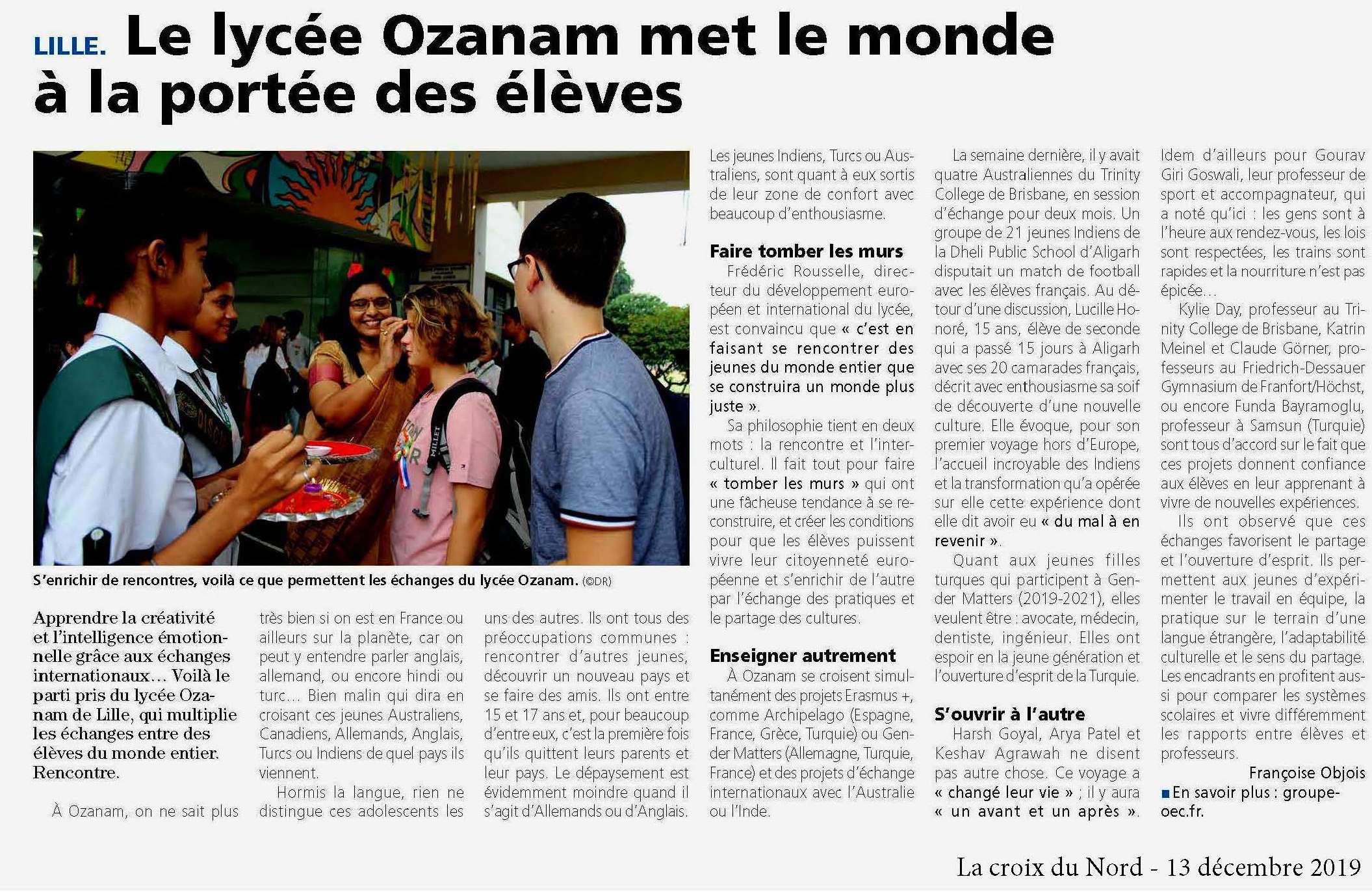 Le lycée Ozanam met le monde à la portée des élèves, c’est ce que Françoise OBJOIS journaliste à la Croix du Nord nous écrit dans son article de presse