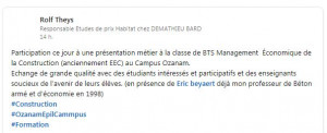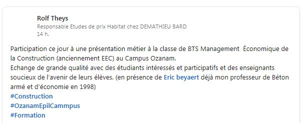 Dans le cadre du stage de 1ère année, les étudiants de BTS Management Economique de la Construction (anciennement EEC) ont échangé avec la société DEMATHIEU BARD sur les métiers accessibles après le BTS. La société était représentée par Rolf THEYS, ancien élève du lycée qui a répondu aux questions des étudiants. Grand merci pour son intervention