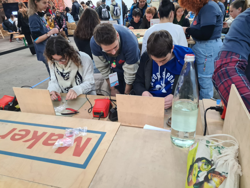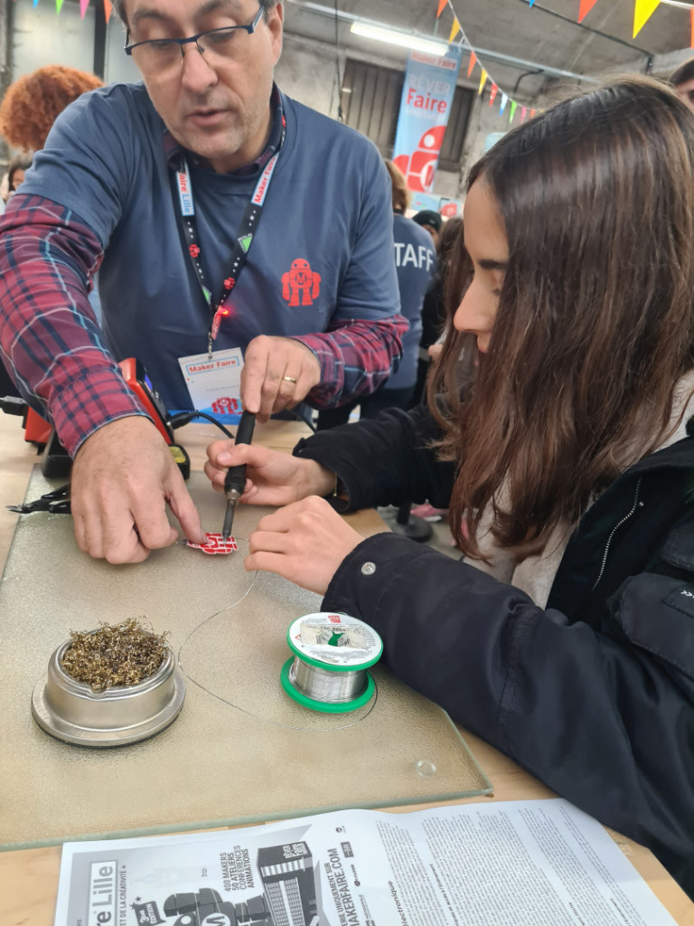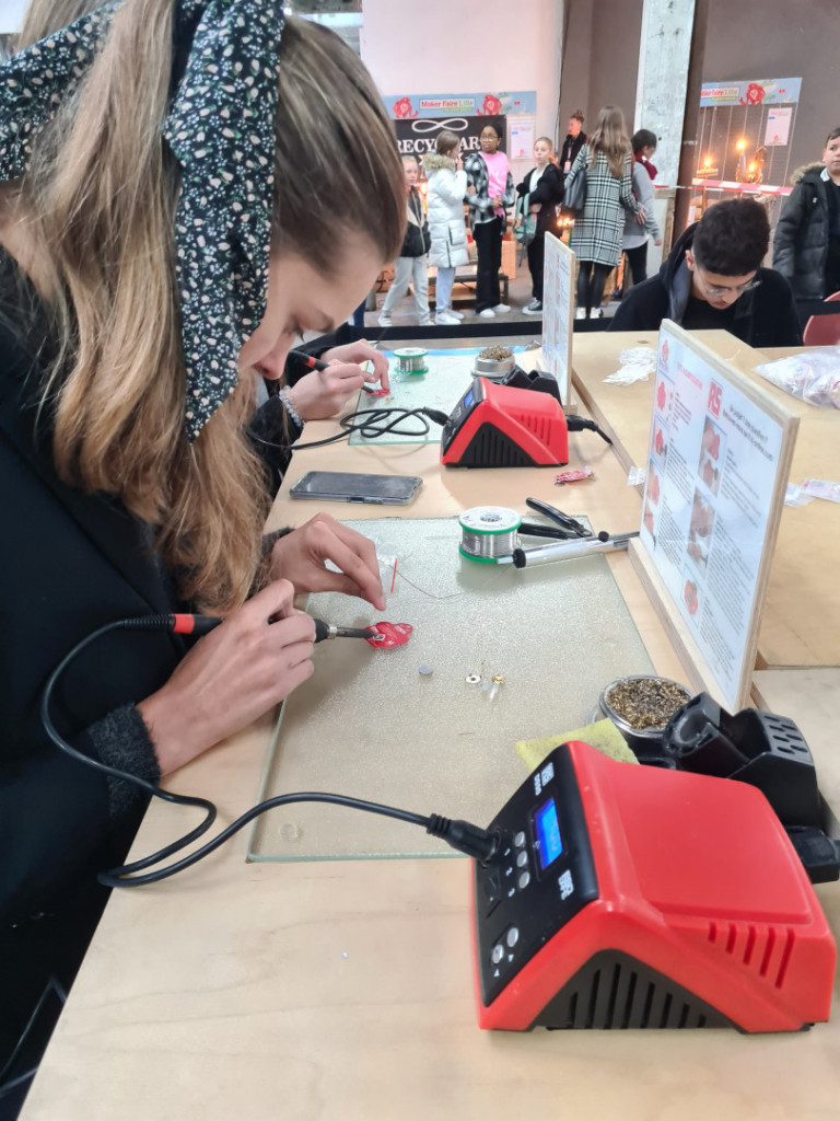 Durant toute la matinée, ils ont découvert les centaines de stands et ateliers du festival de l’innovation et de la créativité « Maker Faire ». La classe a tout d’abord participé à l’atelier soudure, où les élèves ont chacun pu souder leur robot afin qu’il émette de la lumière. Cette activité a connu un certain succès, car la plupart des élèves de la classe ne s’y étaient jamais essayé auparavant.