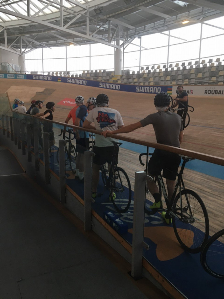 Enfin, le troisième objectif de cette visite était également humain ! Rouler sur un vélo sans frein, ni dérailleur et sur des virages en bois inclinés à plus de 44° est un vrai défi mental, personnel et humain (un travail d’équipe et d’encouragement surtout !)